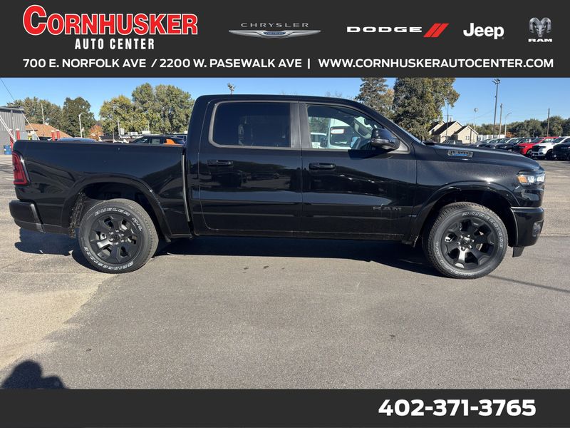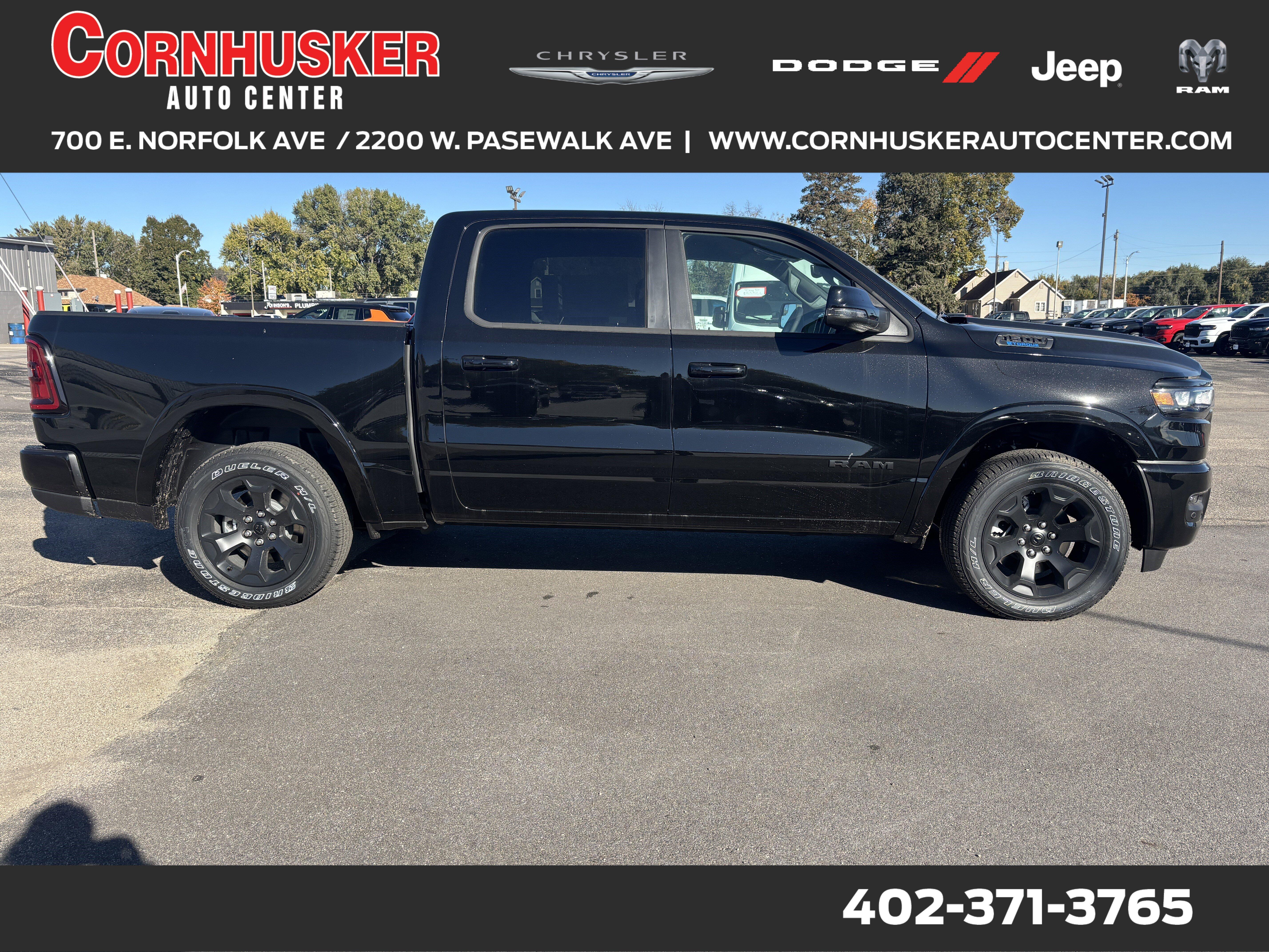 The 2025 Ram 1500 Big Horn Crew Cab 4*4 in Diamond Black Crystal Pearl-Coat blends command and comfort into one capable package. Under the hood is a 3.6L V6 eTorque engine with Stop/Start, mated to an 8-speed automatic 850RE transmission, delivering an EPA-estimated *19 MPG city / 24 MPG highway / 21 MPG combined*. The Big Horn trim is loaded out, featuring 20-inch aluminum painted-clad wheels, the Night Edition Package, Big Horn Level 2 Equipment Group, heated front seats, heated steering wheel, and 8-way power adjustable driver's seat with lumbar support. Add in safety and driver aids like Adaptive Cruise Control with Stop & Go, Blind-Spot & Cross-Path Detection, ParkSense front and rear park-assist, ParkView rear back-up camera, and more. With a MSRP around *$59,095* including destination, this Ram is ready for work, adventure, and daily comfort. Visit Cornhusker Auto Center at *700 E Norfolk Ave, Norfolk, NE 68701* to take it for a spin.