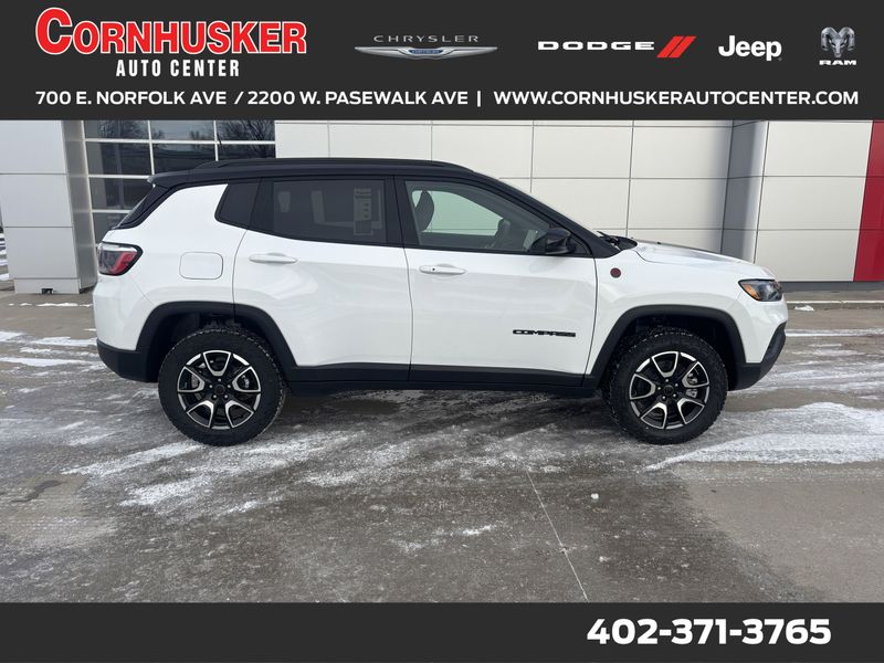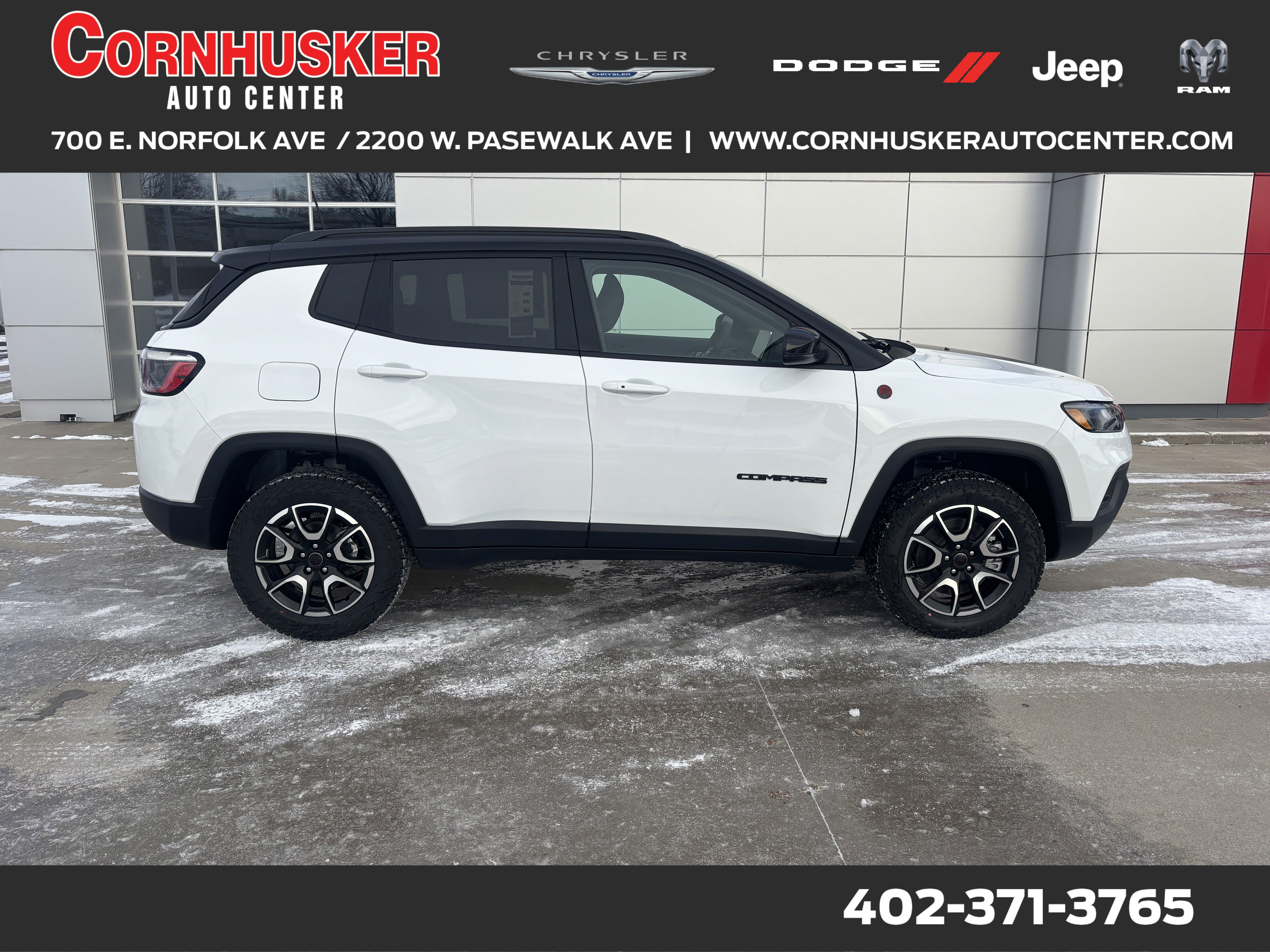 The 2026 Jeep Compass Sport Utility in Bright White Clearcoat offers a perfect combination of performance, style, and efficiency. Powered by a 2.0L Intercooled Turbo I-4 engine, this compact SUV delivers an impressive EPA-estimated 31 MPG on the highway and 23 MPG in the city. Paired with an automatic transmission and 4WD drivetrain, the Compass provides a smooth and responsive driving experience, whether you're navigating city streets or exploring off-road trails.Inside, the Ruby Red/Black interior creates a modern, comfortable cabin with plenty of space for passengers and cargo. This SUV is packed with features to enhance both convenience and safety, including an intuitive infotainment system, advanced driver-assist technologies, and ample cargo room for your gear. Whether you're commuting, running errands, or heading out on a weekend adventure, the 2026 Jeep Compass is designed to make every drive enjoyable and efficient.Ready to experience this stylish and capable 2026 Jeep Compass? Visit Cornhusker Auto Center at 700 E Norfolk Ave, Norfolk, NE 68701---your local New Car Dealership in Nebraska. We're just minutes away and excited to help you get behind the wheel of this fantastic SUV!